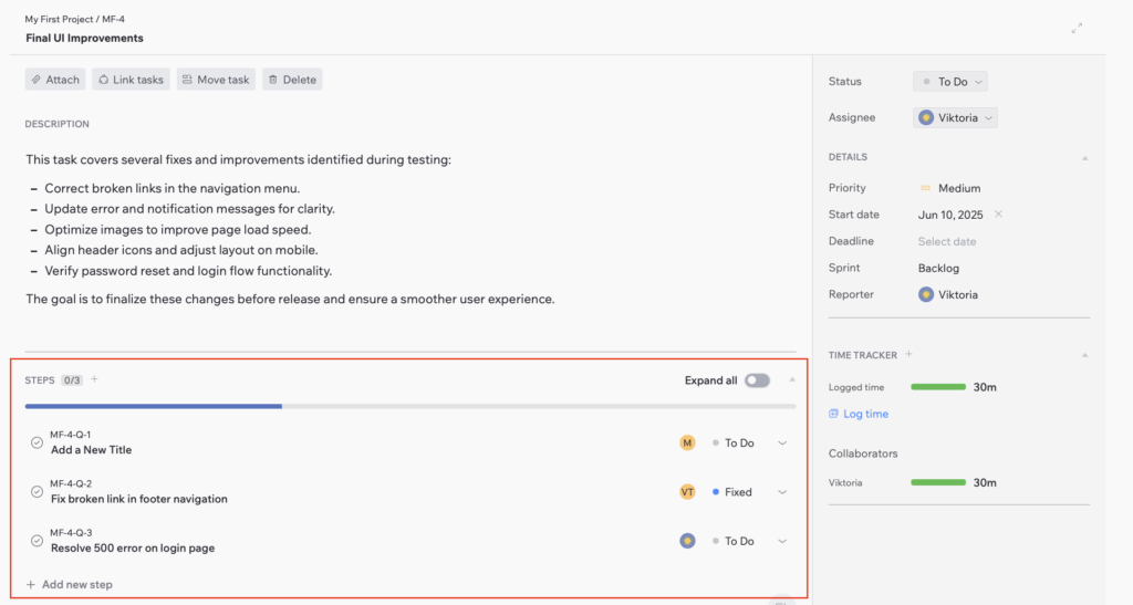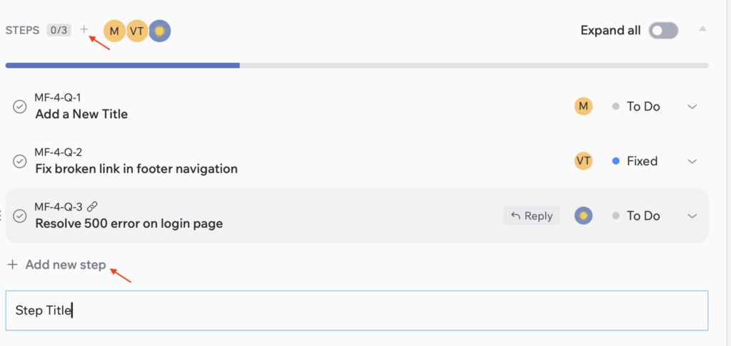 The Steps is a block on Task page and Quick View page. It allows you to break a task into smaller items or track bugs directly inside the task.