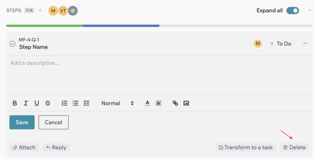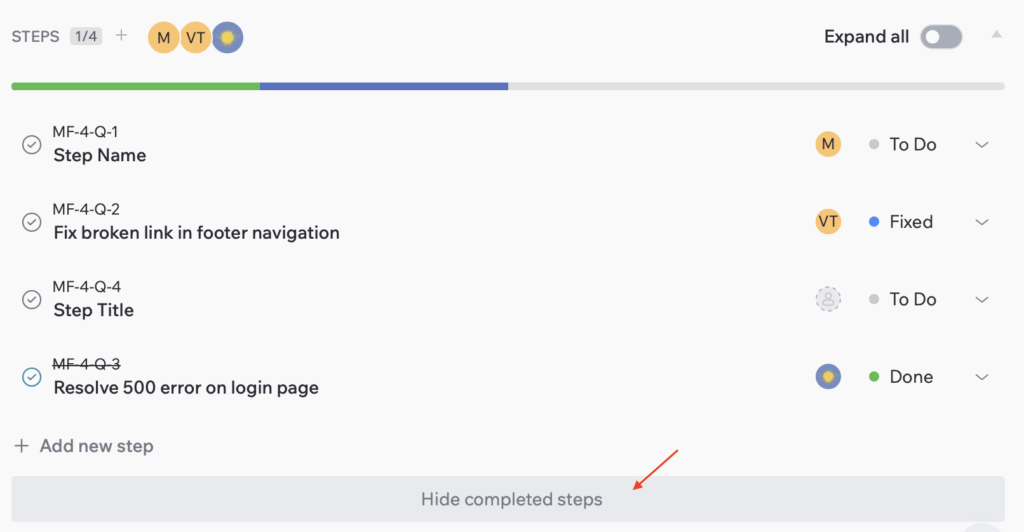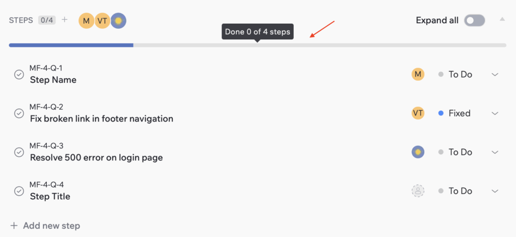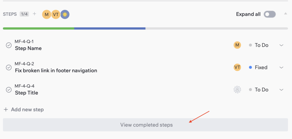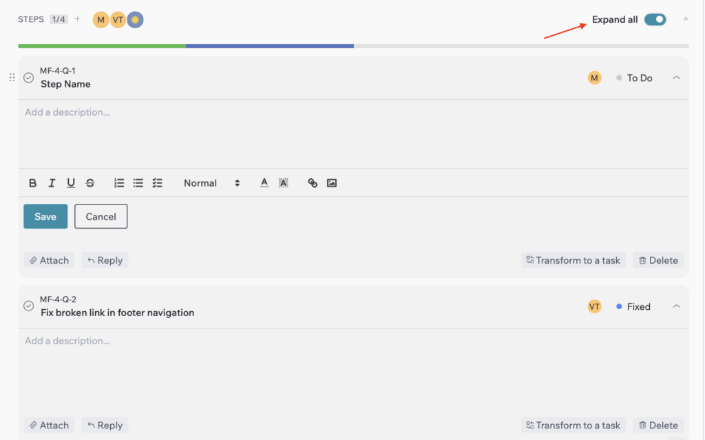 By default, each step is collapsed. You can expand or collapse a step by clicking anywhere on its row. The “Expand all” button lets you open every step in the list at once. When turned on, all steps expand to show their descriptions, attachments, and details.
