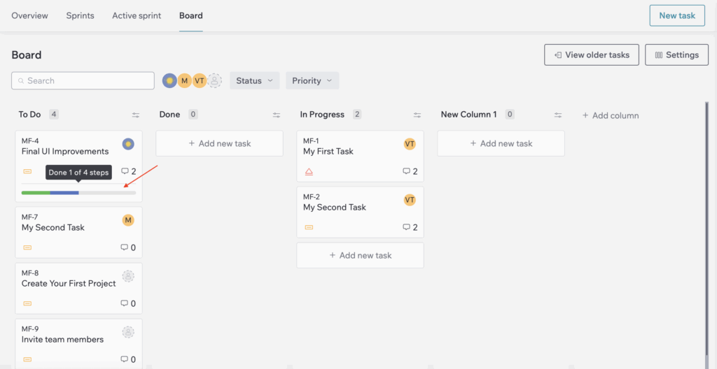 This progress bar also appears on the Board Page, at the bottom of each task card, so you can quickly see how many steps are Done (green color), Fixed (blue color), or still To Do (grey color) without opening the task.